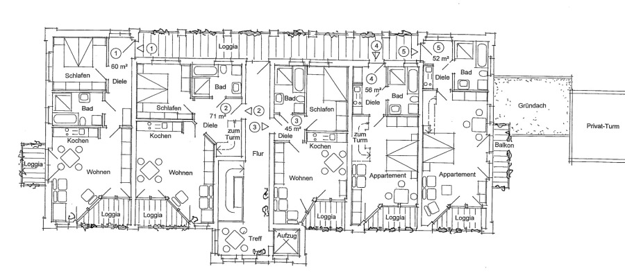 - Außenflächen: 3 Balkone, 250 m² Sonnenterrasse + Sauna-Terrasse mit